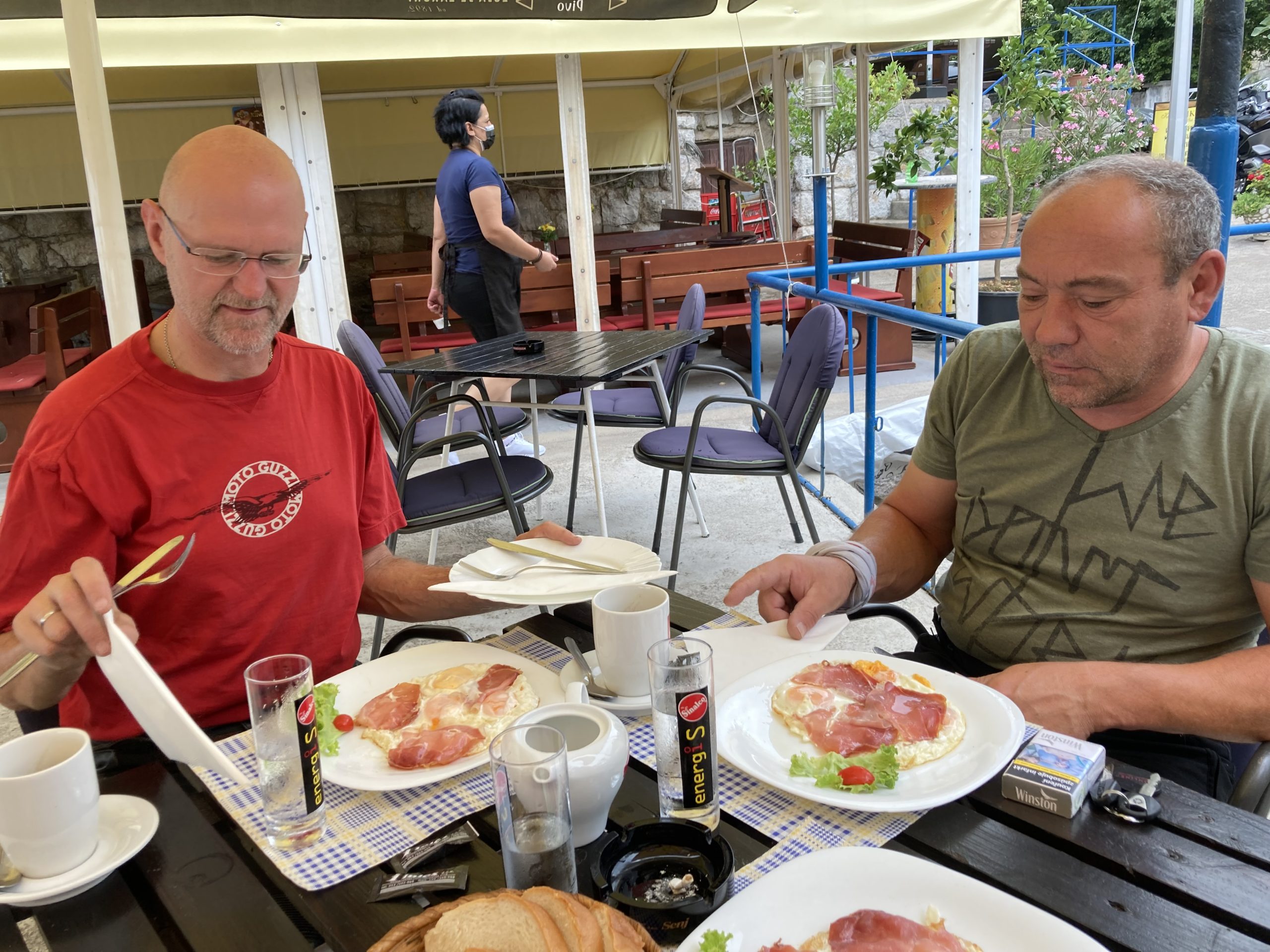 Angekommen, herausgeputzt und den örtlichen Stiegenwirt gesucht, hat uns tatsächlich einer mit Hirter Bier vom Fass überrascht. Da wird geblieben! Am Tag 3 ruft die Küstenstraße und der Winnetou. Der erste gemütliche Gastgarten wird für´s Frühstück angesteuert. Eier mit Speck, wie sich das hier gehört.