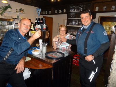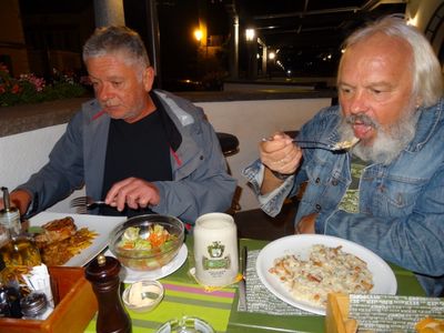 Perfekte Pizza beim Lampl (Gründungslokal der schneidigenmanda), Rotwein aus der Region, da blüht das Herz des Bikers.