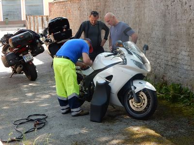 Zügig geht’s quer durch Österreich und Slowenien ins „Stammlokal“ Mance in Brod na Kupi, in Kroatien. Gerry, der Guide, der Guzziandi und Erwin verbringen einen netten Abend und müssen den hausgemachten Schnaps vom Wirt ausgiebig kosten. Samstags um 9:00 Uhr wird gestartet, nur die Prinzessin (Triumph) streikt. Als braver Besitzer von Schutzbrief, grüner Versicherungskarte, Kirchenbeitragsbescheid und anderer hilfreicher Mitgliedschaften, ist Hilfe schnell gerufen. Ein Automechaniker macht sich über das Bike her.